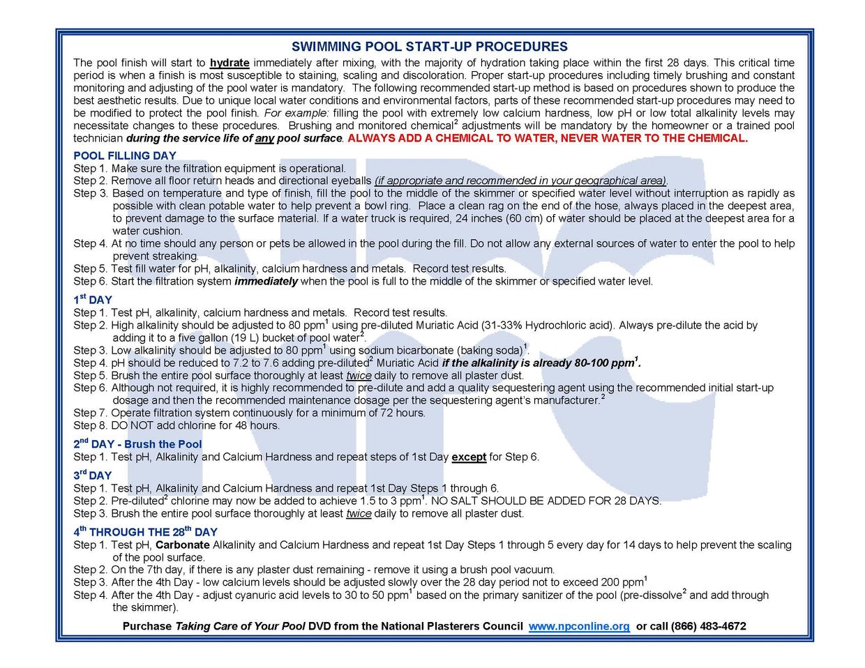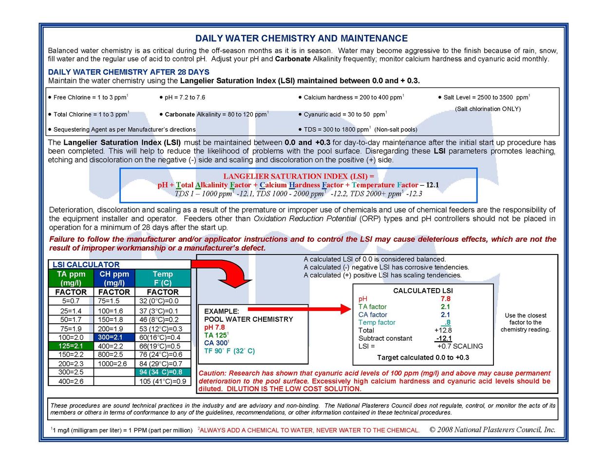 We would all like to think a pool is care free but that could not be further from the truth! One of the most crucial variables to a beautiful finish is water chemistry. Austin Pool Plastering recommends following the National Plaster Councils recommendation for all finish start ups(see below).